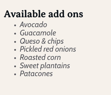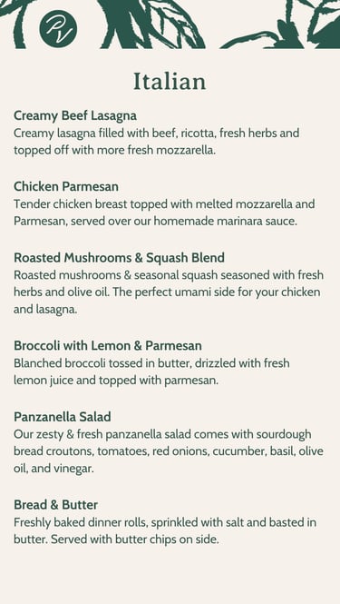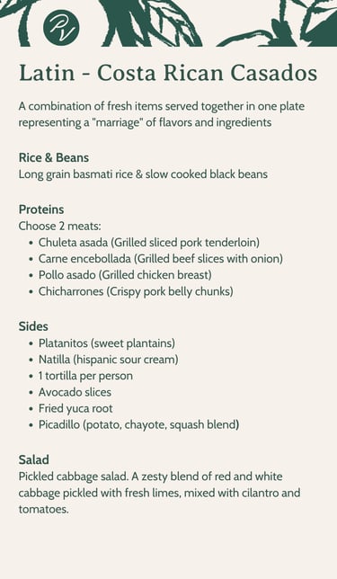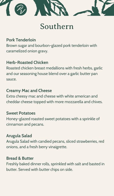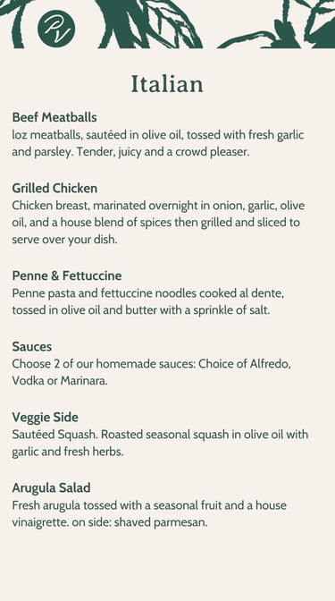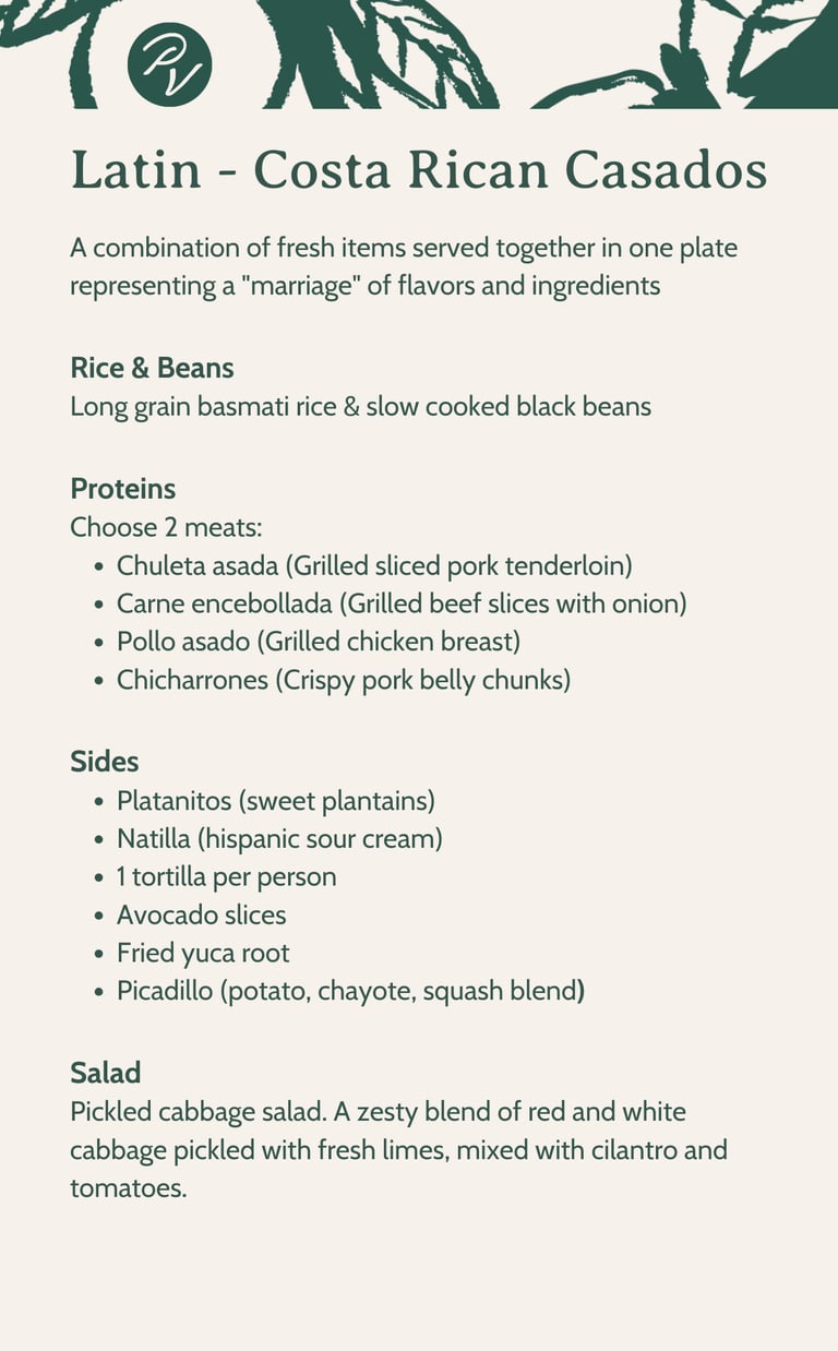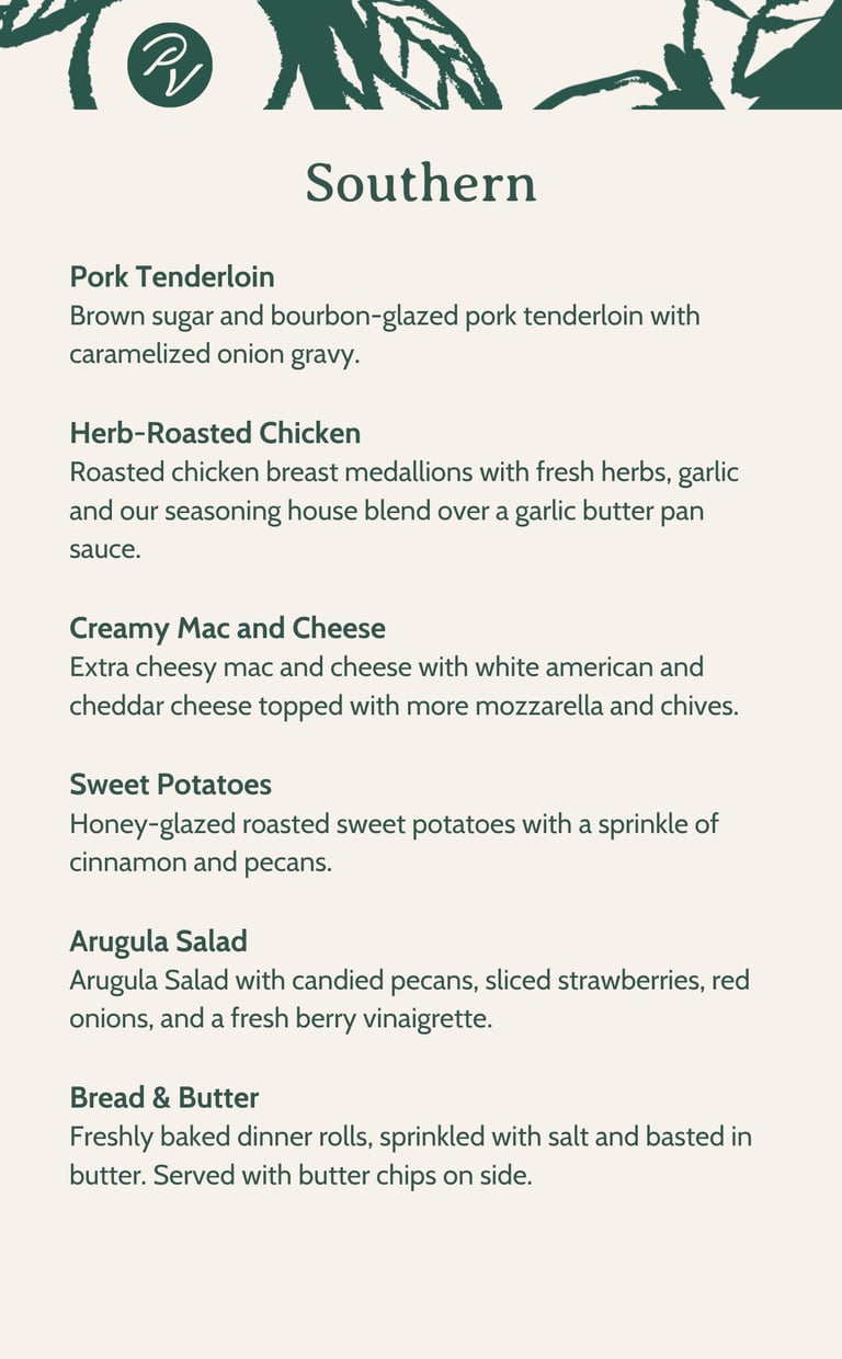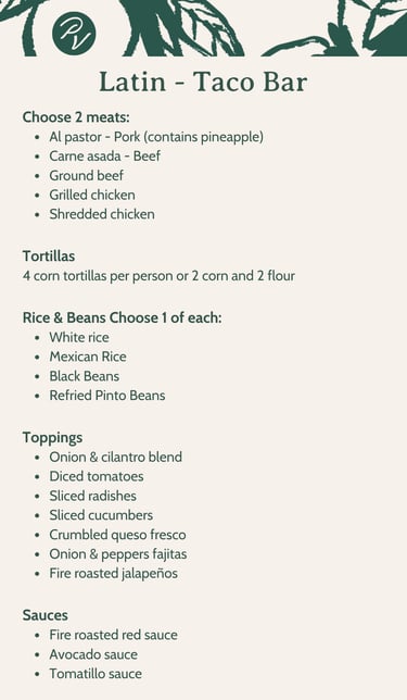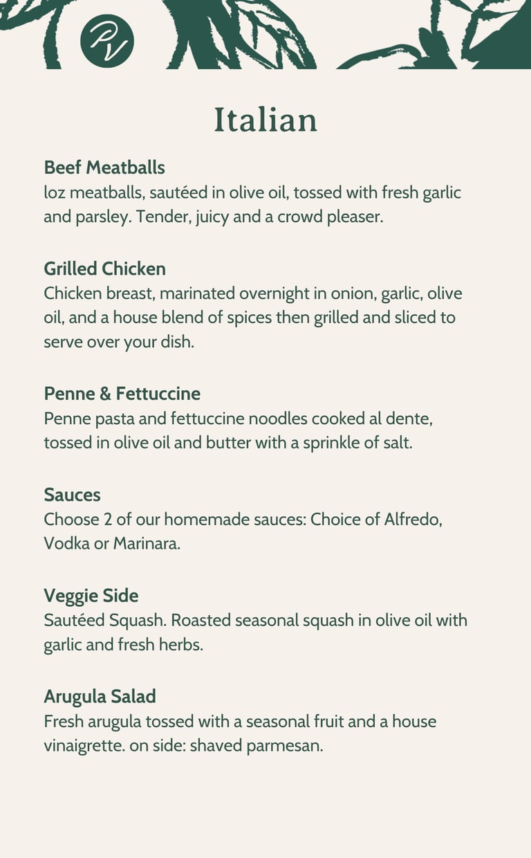 Indulge in our luxurious catering options featuring Italian, Latin, and Southern comfort cuisines. Check our preset menus below or contact us to create your very own personalized menu that reflects your style.
